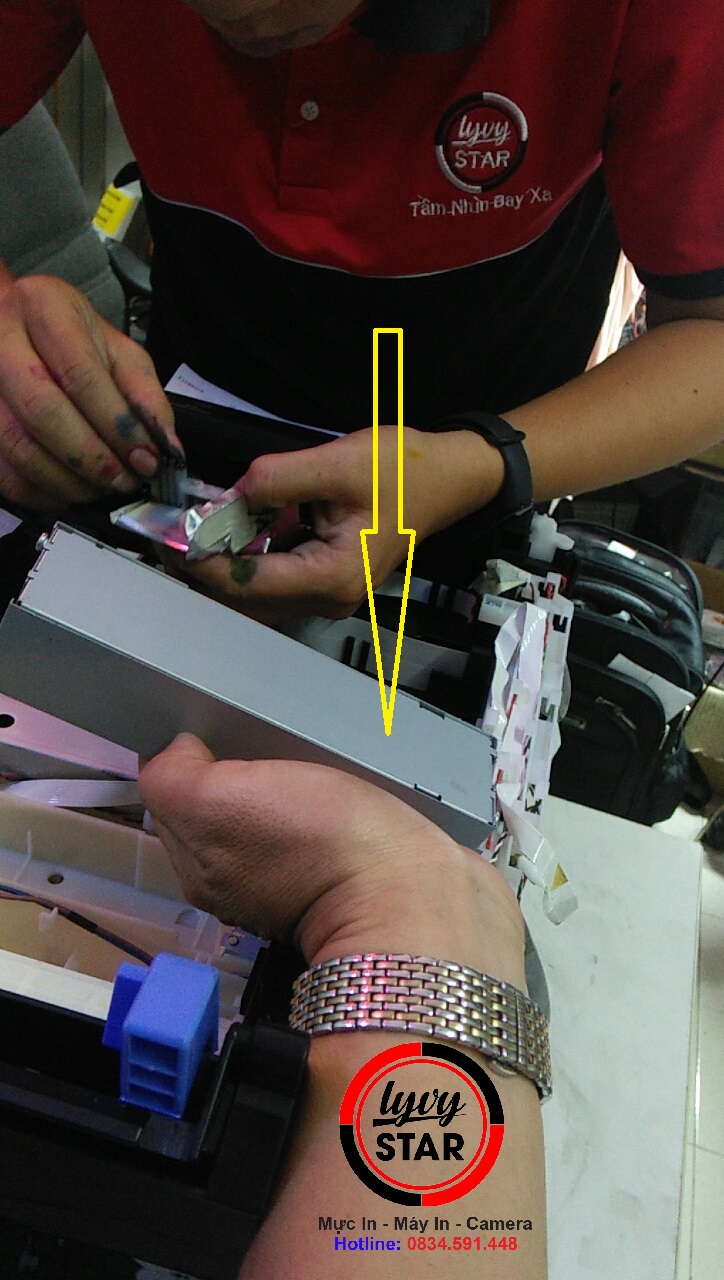 Nhân viên mực in Lyvystar đang tháo bo nguồn,đầu phun,bo fomater của máy in Epson C5290 để thay cho khách.hàng zin mới 100% ..Hàng tháo máy là máy mới chứ không phải máy đã dùng rồi.